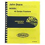 REP2750 Operators Manual Reprint John Deere 40 John Deere 40 series tractor Replaces: OMR2455 102 Pages An operators manual sometimes referred to as the owner`s manual is the manual that came with the tractor. It is the manual that was given to the ultimate consumer by the manufacturer. It can be compared to the manual you receive in the glove box of a new car. This manual give the owner-operator instructions, shift patterns, capacities (antifreeze, crankcase, etc.) and adjustment procedures (brakes, clutch, etc.). This is a very useful and valuable tool in operating your tractor.